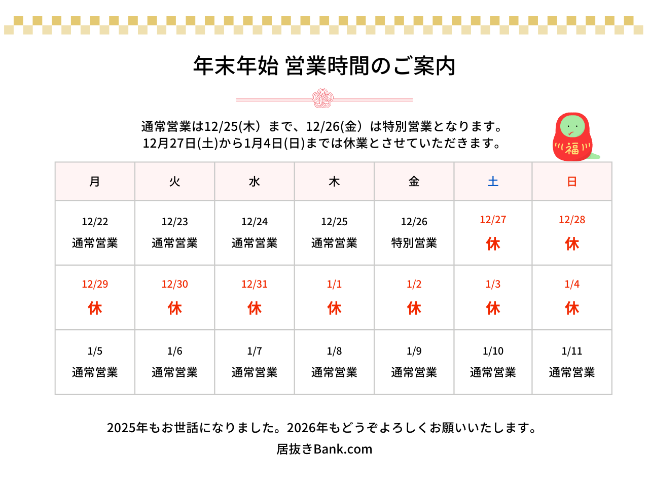 【2025→2026年末年始営業日のお知らせ】